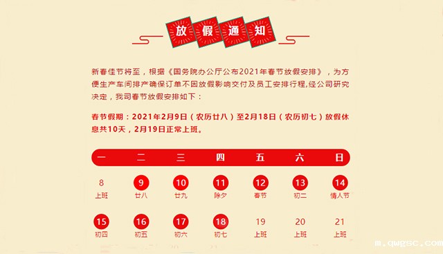 春节假期:2021年2月9日(农历廿八)至2月18日(农历初七)放假休息共10天,2月19日正常上班。